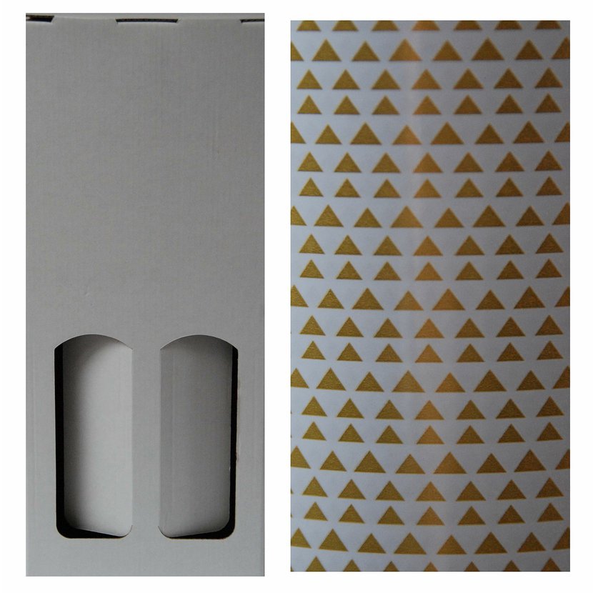 Balení 2 lahví do krabice včetně balení do dárkového papíru - barva papíru bílo zlatá - viz obrázek.