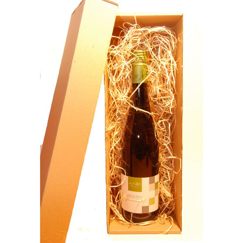Balení 1 lahve do papírové krabice s víkem. Krabice je vyplněná dřevitou vlnou.